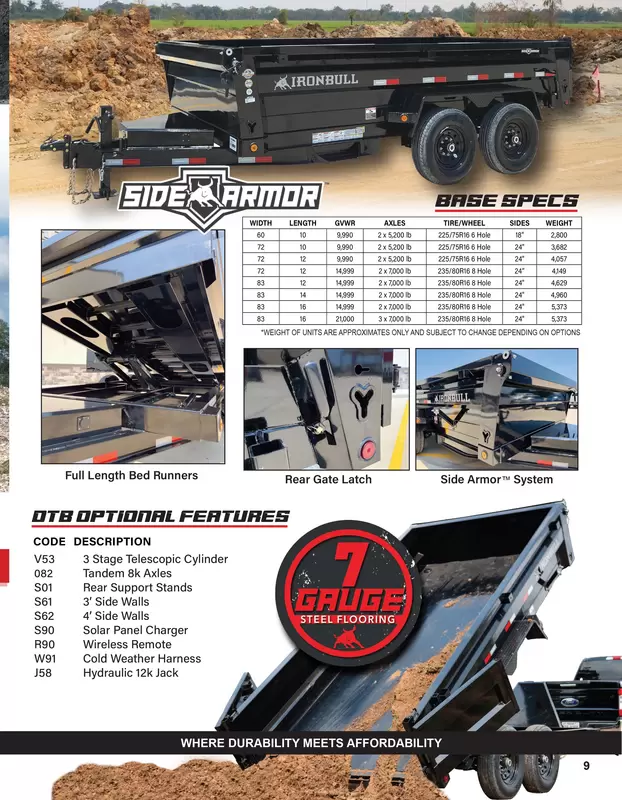 The Iron Bull DWB Dump Trailer is a powerhouse of durability and efficiency. It comes equipped with a robust 8” monoframe I-beam construction and heavy-duty 7-gauge steel flooring, making it more than capable of handling demanding loads with ease. While it’s 2 inches shorter than our DTB model, the DWB is built with the same rugged, performance-driven user in mind. Designed for those who demand strength and simplicity, the DWB is available in standard configurations only, but don’t let that fool you—it’s packed with all the essential features you need!