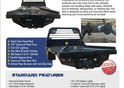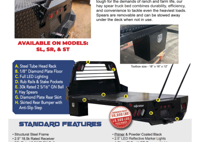Maximize productivity with a truck bed designed specifically for hauling and handling hay. Built tough for the demands of ranch and farm life, our hay spear truck bed combines durability, efficiency, and convenience to tackle even the heaviest loads. Spears are removable and can be stowed away under the deck when not in use.