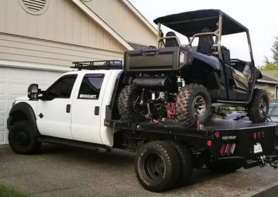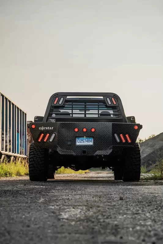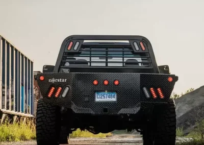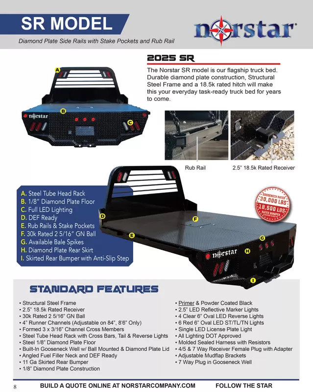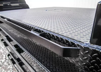 The standard 2.5″ receiver allows you to add a hitch for bumper pull cargo and a 2 5/16″ gooseneck ball is standard in case you are hauling a heavyweight. Our receivers are lab tested and certified for 18,500 lbs bumper capacity and 30,000 lbs gooseneck capacity. Durable diamond plate construction and powder coat will make this bed your most faithful assistant for years to come. Tapered corners, 7 way plug with 4 way adapter and recessed 2 5/16″ ball and receiver hitch give you a towing package standard. Exposed stake pockets and rub rail ensure you have tie down points for any load, plus the LED lights are standard on all SRs. Full 11 gauge skirted rear bumpers finish off every model as an additional standard feature.