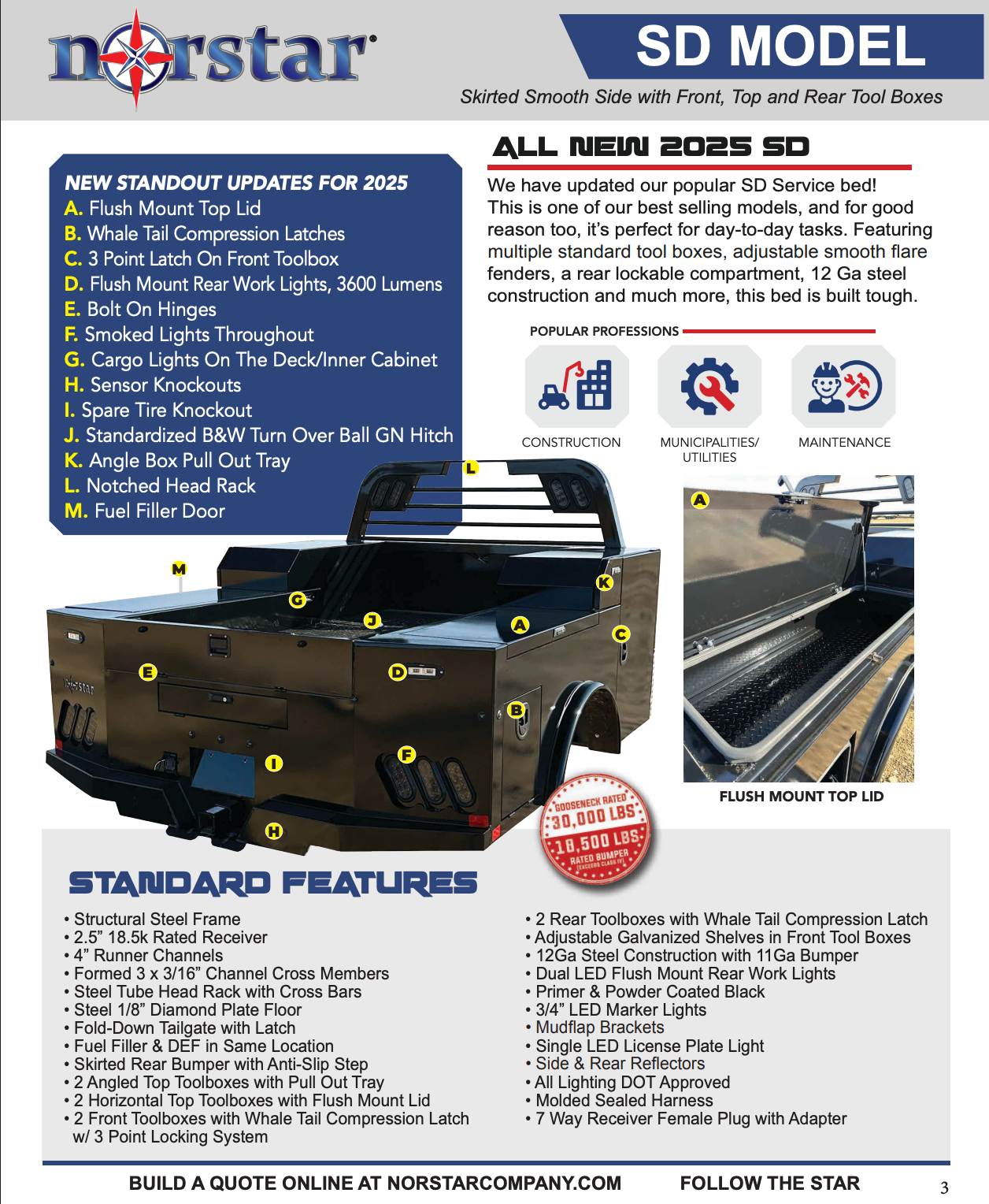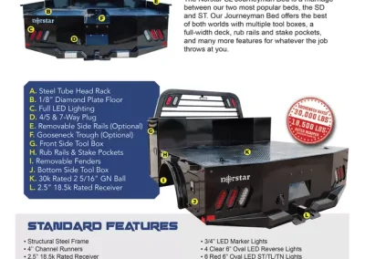 The Norstar SL Journeyman Bed is a marriage between our two most popular beds, the SD and ST. Our Journeyman Bed offers the best of both worlds with multiple tool boxes, a full-width deck, rub rails and stake pockets, and many more features for whatever the job throws at you.