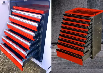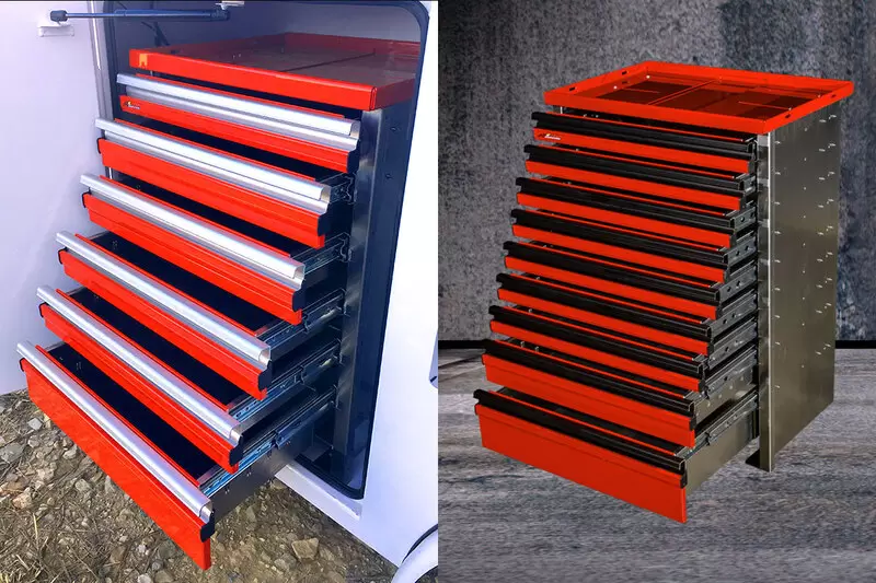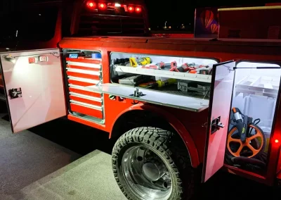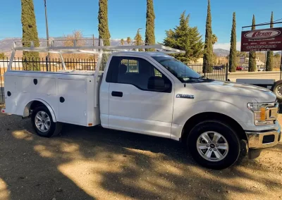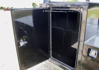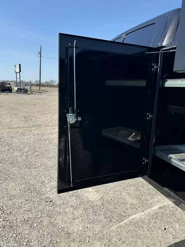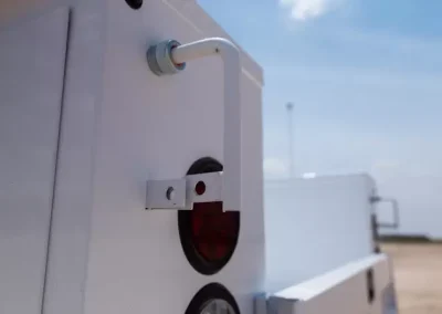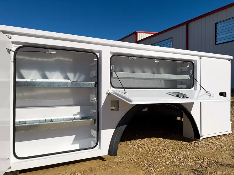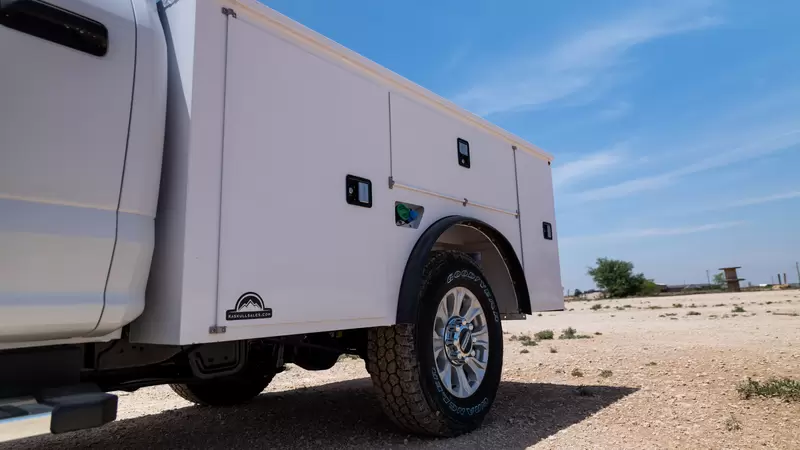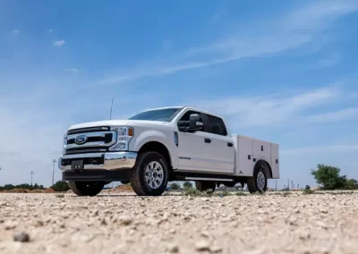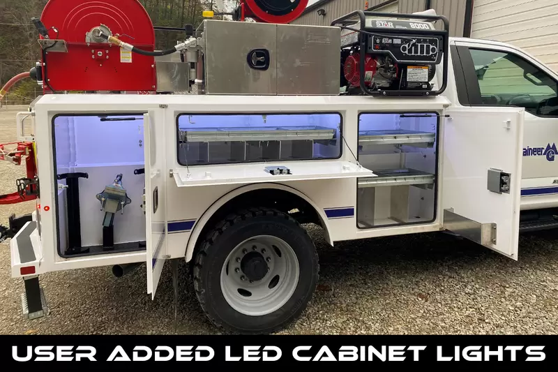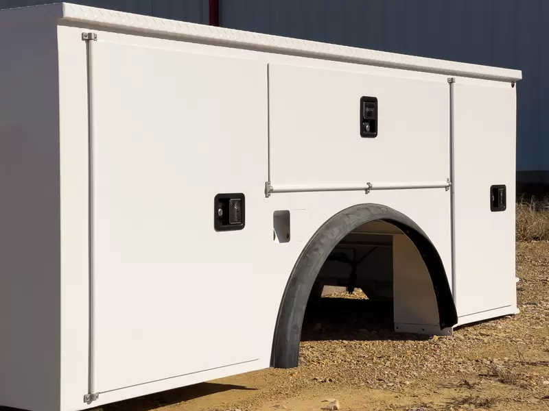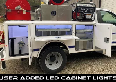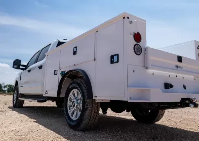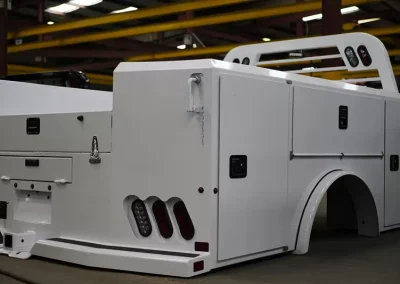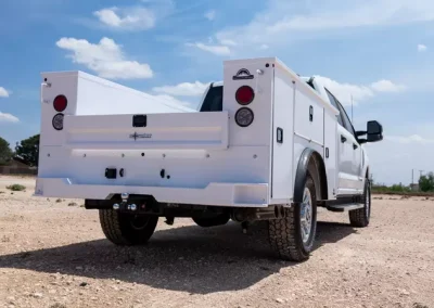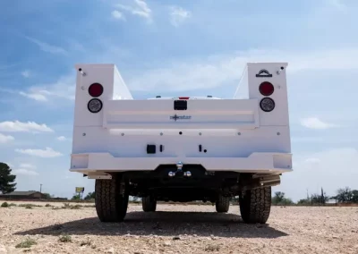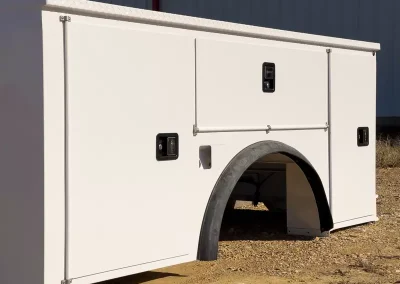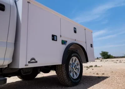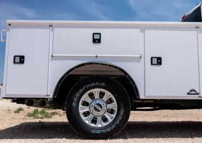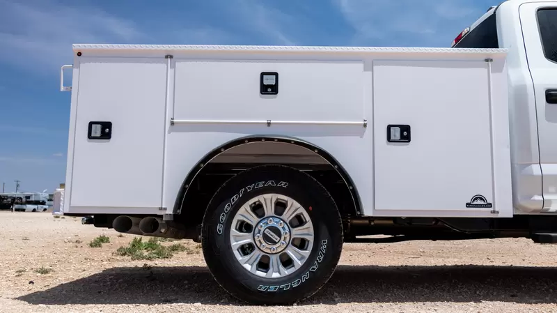 This bed comes with 4 oversized vertical cabinets with standard adjustable galvanized shelving, 2 horizontal cabinets with adjustable galvanized shelving, plus a bonus locking rear shovel compartment for tons of additional storage. All doors are gas shock equipped and locking paddle latches are standard. Our 2.5” bumper receiver allows you to add a hitch for bumper 18,500 lbs of rated pull capacity. Available cabinet drawers can add the finishing touch if you have a lot of parts or tools for your work load. Multiple lighting choices and cast housings are also available. These beds are a perfect complement for any single or dual wheel work truck with smooth 11 gauge sides and white or gloss black powder coating.