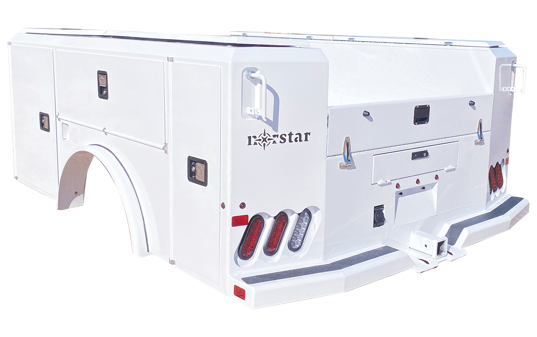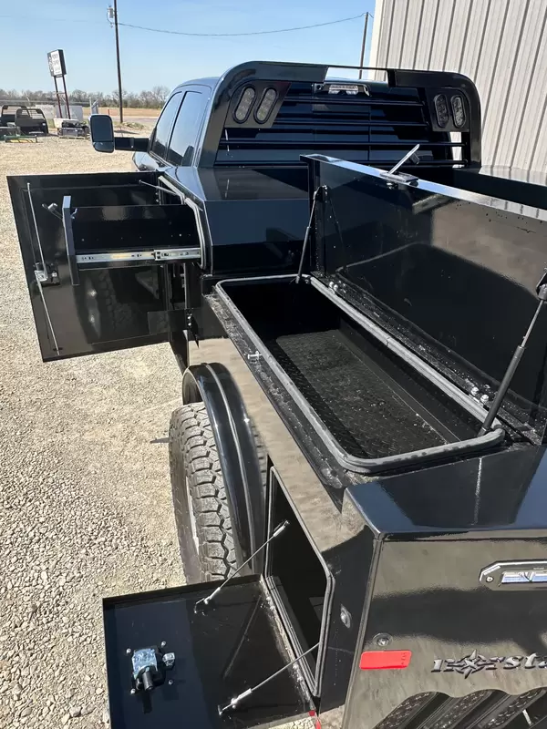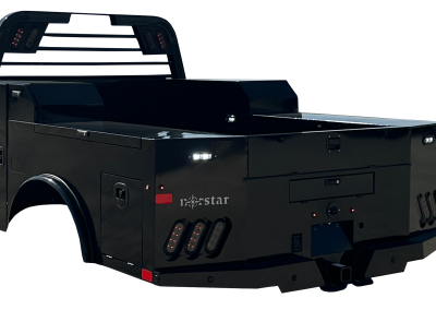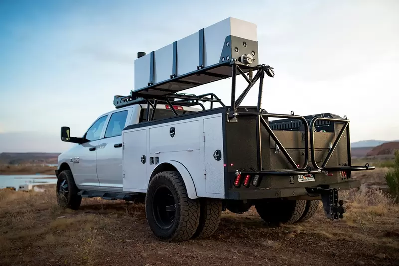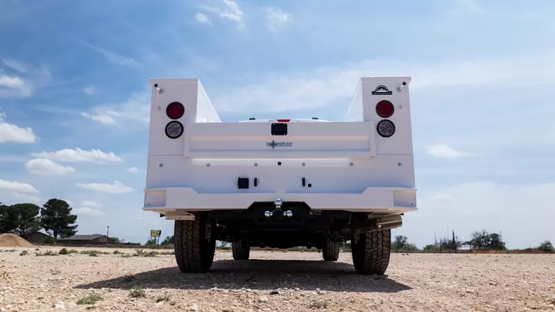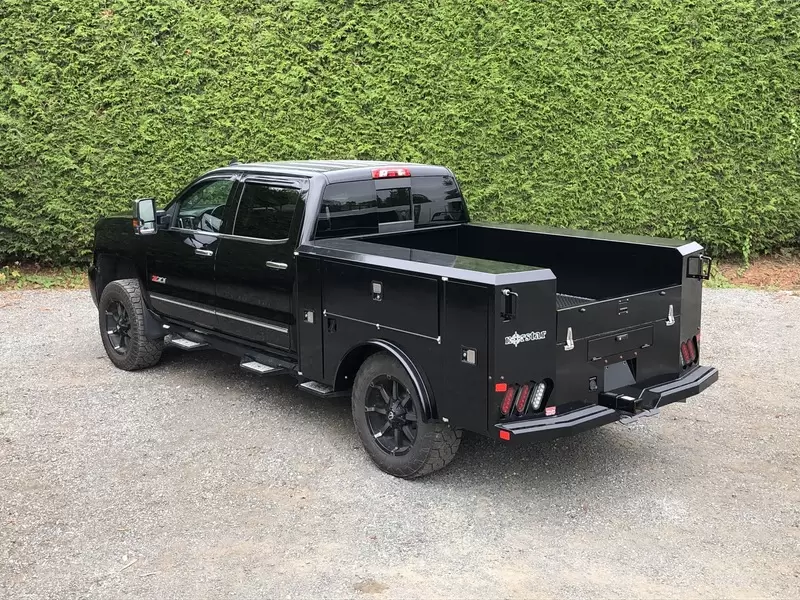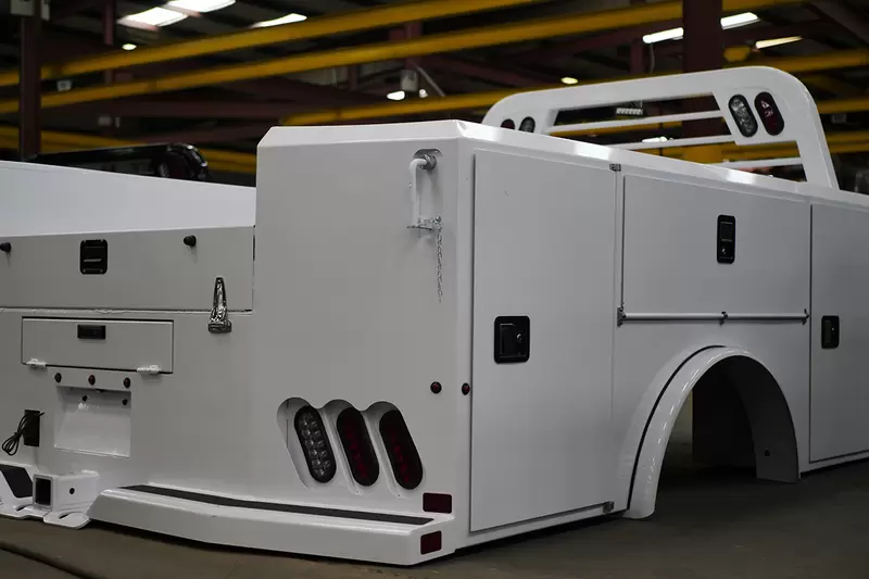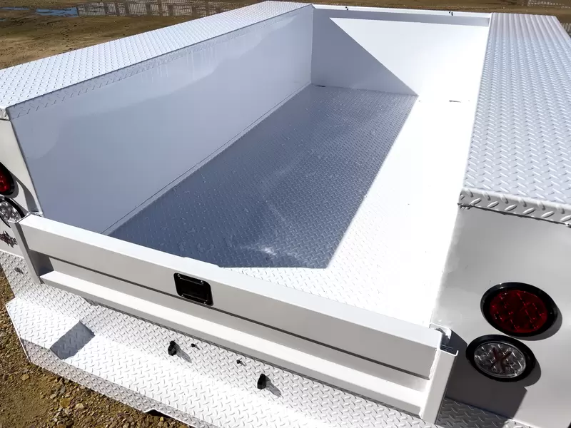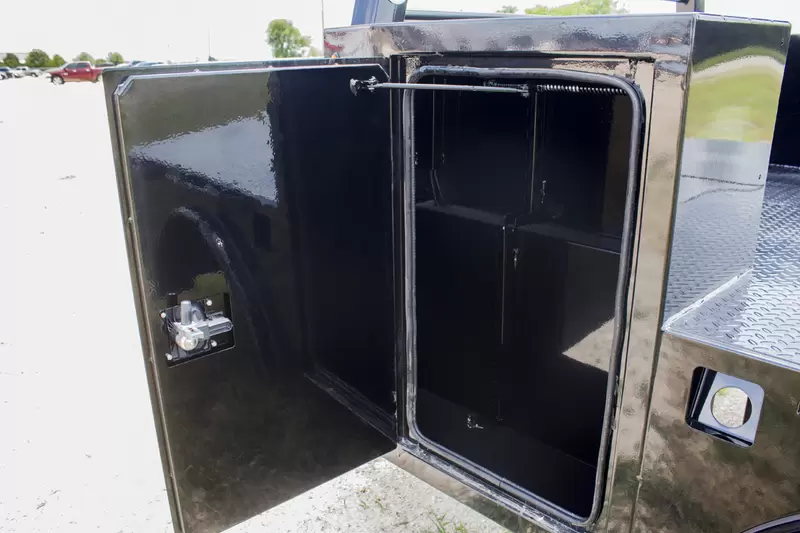 Additional features include adjustable galvanized tool trays with optional cabinet tool drawers for organized storage of tools and parts. The bed also comes standard with dual LED rear work lights producing 3,600 lumens, a tailgate, and a gloss black powder-coated finish for durability. Built with smooth 12-gauge sides and an 11-gauge bumper, this bed is the perfect fit for any single or dual-wheel work truck.
