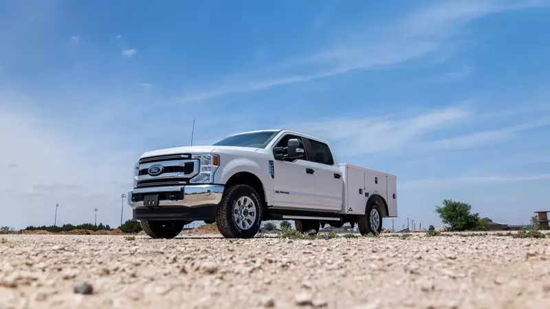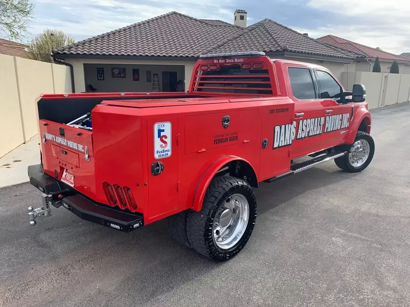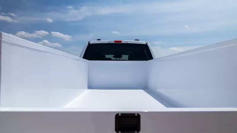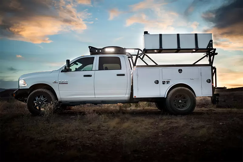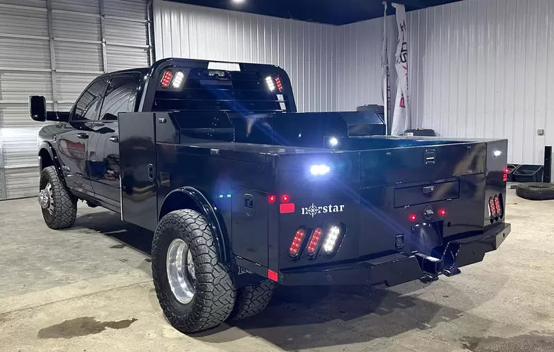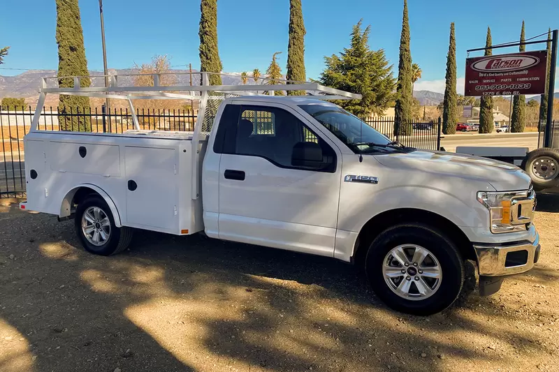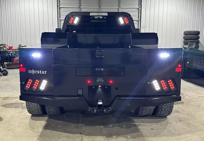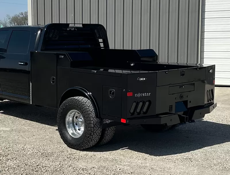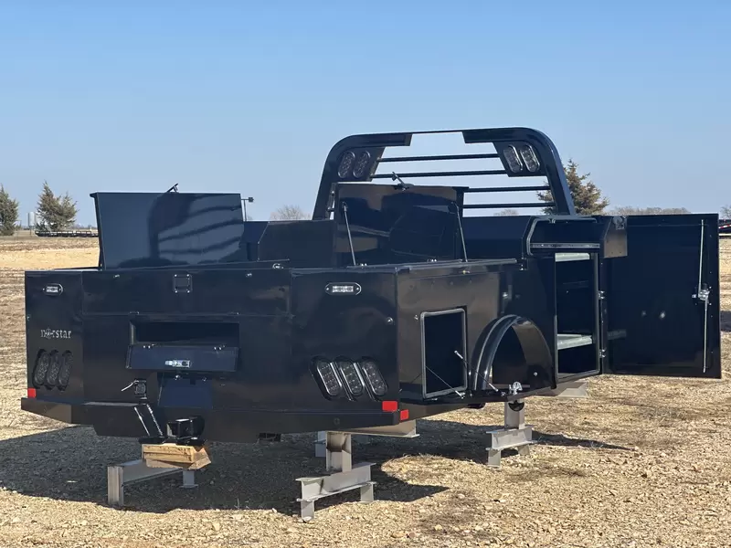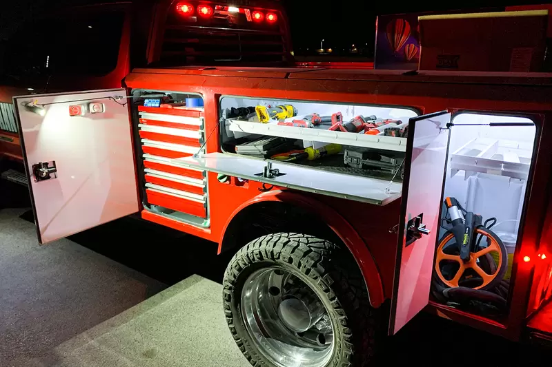 Additional features include adjustable galvanized tool trays with optional cabinet tool drawers for organized storage of tools and parts. The bed also comes standard with dual LED rear work lights producing 3,600 lumens, a tailgate, and a gloss black powder-coated finish for durability. Built with smooth 12-gauge sides and an 11-gauge bumper, this bed is the perfect fit for any single or dual-wheel work truck.