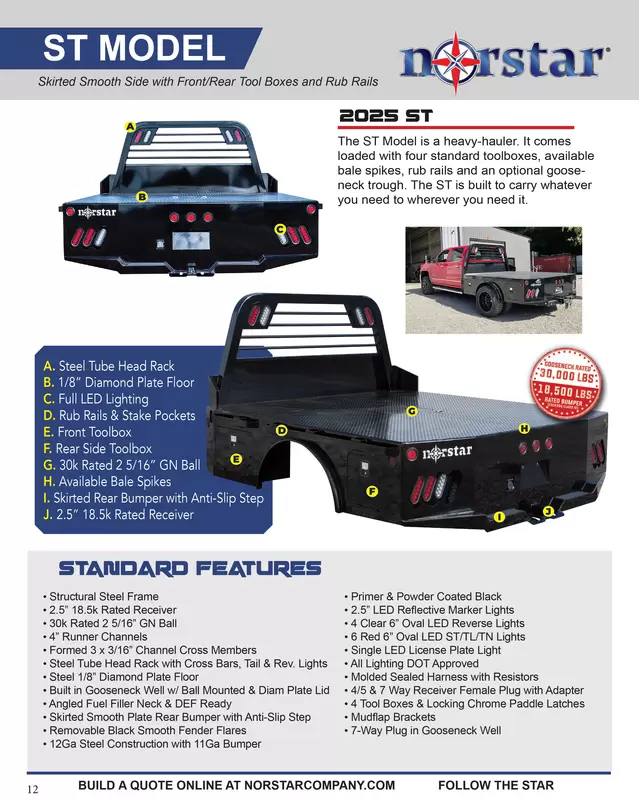 The standard 2.5” receiver allows you to add a hitch for bumper pull cargo, and a 2 5/16” gooseneck ball is standard in case you are hauling a heavyweight. Our receivers are lab tested and certified for 18,500 lbs bumper capacity and 30,000 lbs gooseneck capacity. 1/8” Diamond plate flooring will give you a lifetime of duty and both 7 way and 4 way towing plugs make sure you can hook up and go any time. Standard lifetime LED lights ensure you will never be left in the dark, and the tubular steel headache rack will protect your cab from most anything you can throw its way. Standard angled corners help you maneuver into tight spaces and standard exposed rub rail and stake pockets give you plenty of contact points for securing any load. Check out our optional features and build a bed to suit your workload today.