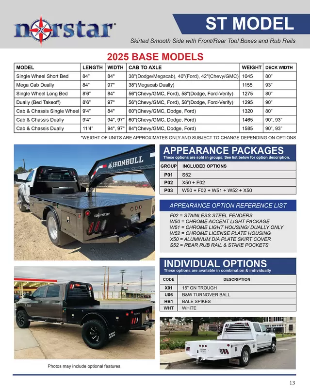 Example: ST 9’4”L x 97”W x 60”CTA x 34” Runners (Add options) Note: 11’ long beds will have 84” CTA