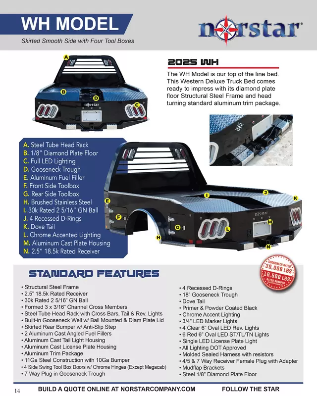 The WH Western Deluxe Bed is our top of the line bed. It is sure to win first in class when you combine it with your first class hauling rig. Accessories abound and the details have been sweated to ensure spectacular fit and finish. But this bed is not all show, it has the same rugged construction as every Norstar bed and can haul anything your rig can pull.